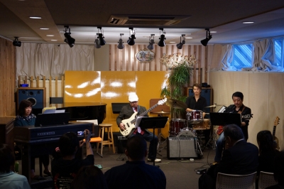 三響ミュージックスクール講師の村山先生(Pf)・山田先生(Gt)・岸林先生(Dr)の