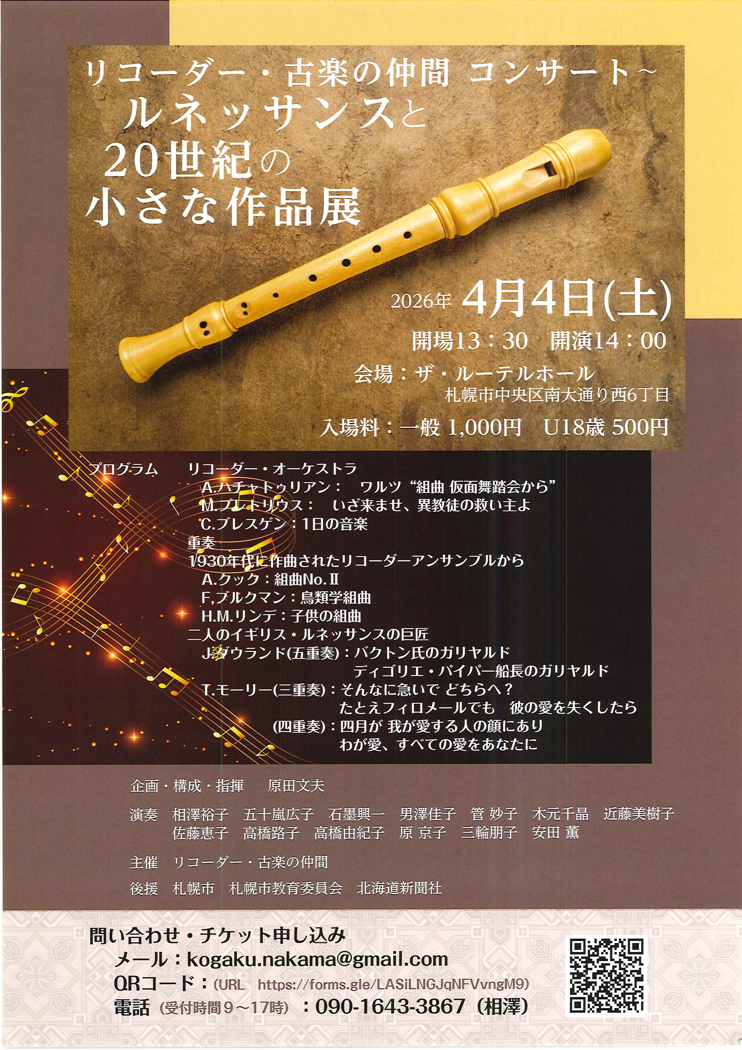 リコーダー・古楽の仲間 コンサート ルネッサンスと20世紀の小さな作品展
