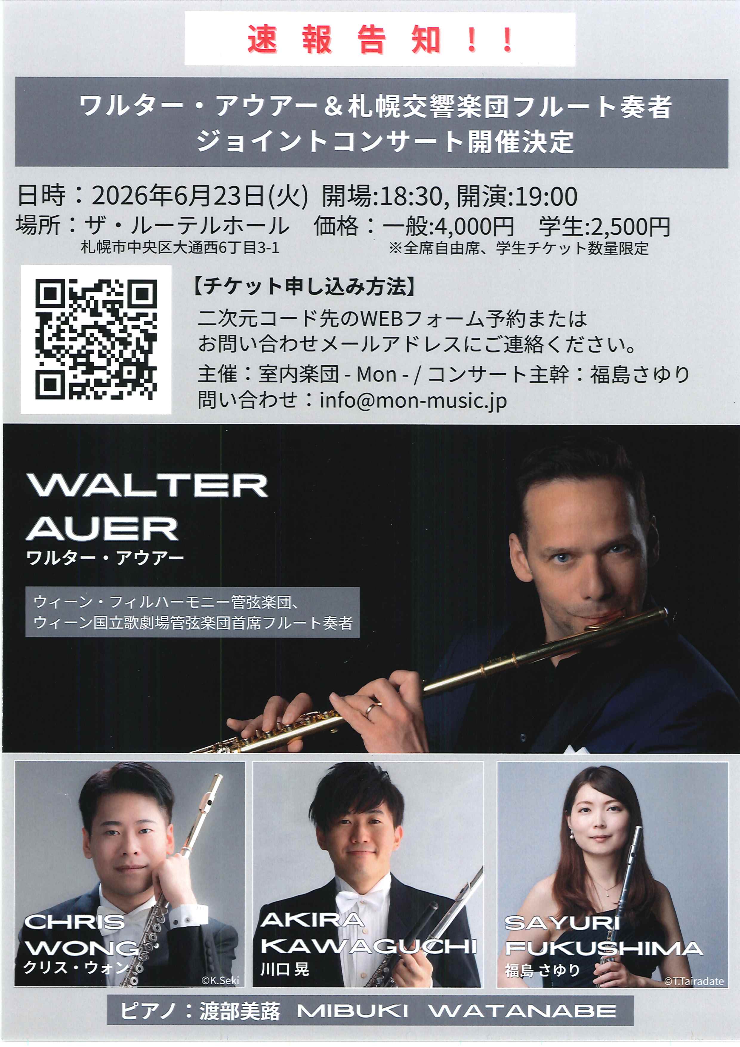 ワルター・アウアー&札幌交響楽団フルート奏者 ジョイントコンサート 開催日2026年06月23日(火)開場18:30開演19:00会場ザ・ルーテルホール札幌市中央区大通西6丁目3-1料金当日:¥4,000学生:2,500円 ※全席自由席、学生チケット数量限定当店での チケット取扱い無し 出演お問い合わせinfo@mon-music.jp 演奏会情報一覧へ戻る