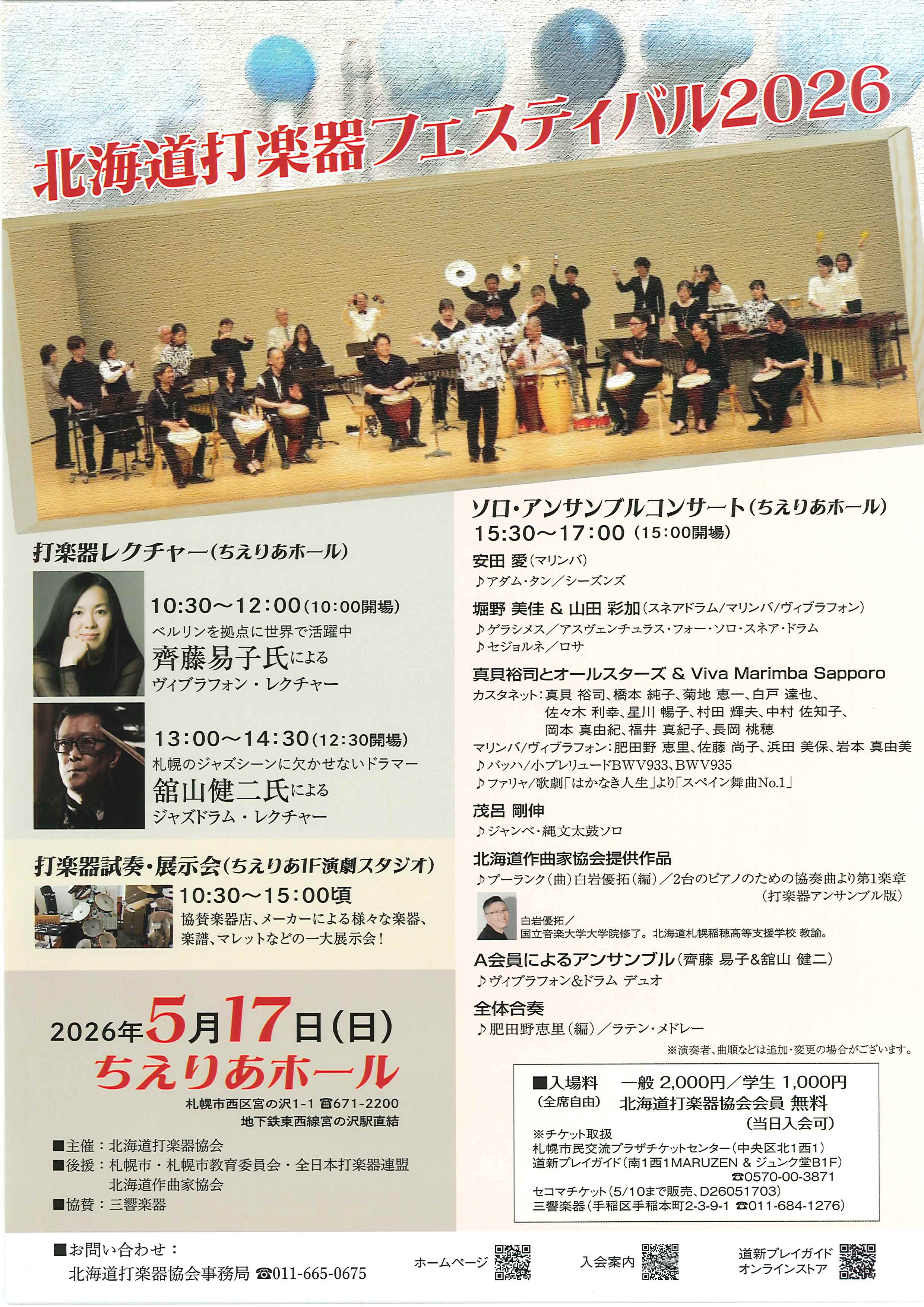 北海道打楽器フェスティバル2026 開催日2026年05月17日(日)開場:開演10:30会場ちえりあホール札幌市西区宮の沢1条1丁目1-10料金当日:¥2,0003月下旬発売開始予定当店での チケット取扱い有り 出演齊藤易子 館山健二お問い合わせ北海道打楽器協会事務局(能智) 011-665-0675 演奏会情報一覧へ戻る