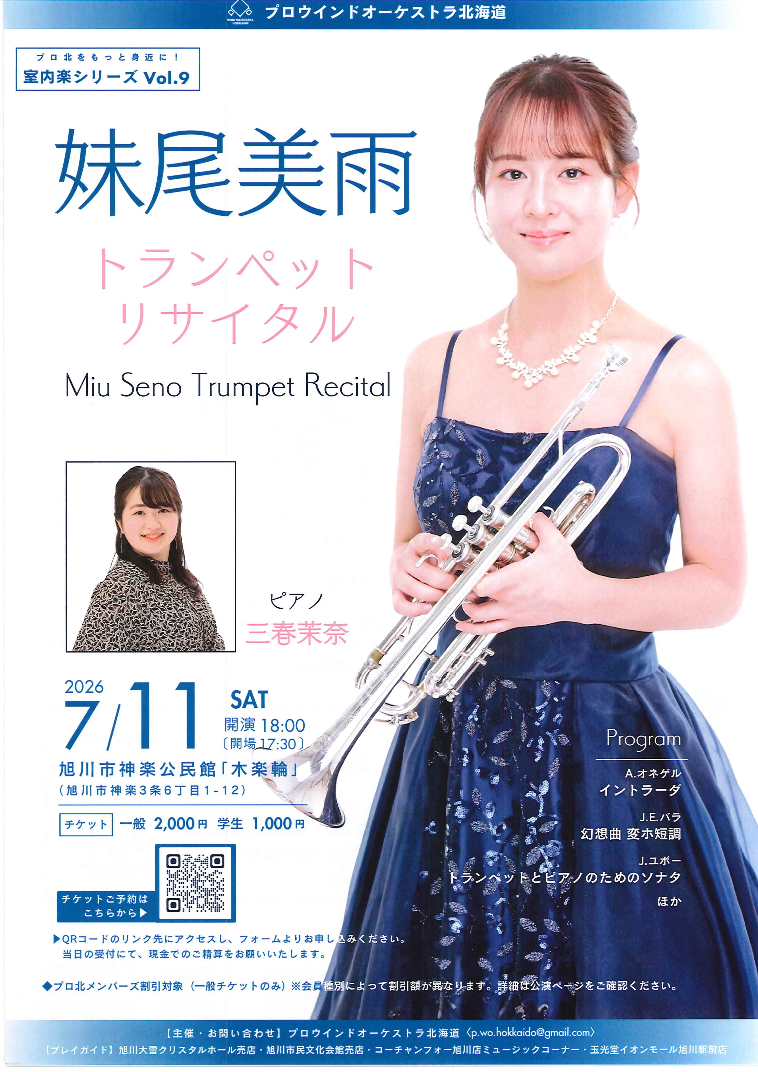 妹尾美雨トランペットリサイタル 開催日2026年07月11日(土)開場17:30開演18:00会場旭川市神楽公民館「木楽輪」旭川市神楽3条6丁目1-12料金当日:¥2,000学生1,000円 当店での チケット取扱い無し 出演お問い合わせプロウインドオーケーストラ北海道 p.wo.hokkaido.kouhou@gmail.com 演奏会情報一覧へ戻る
