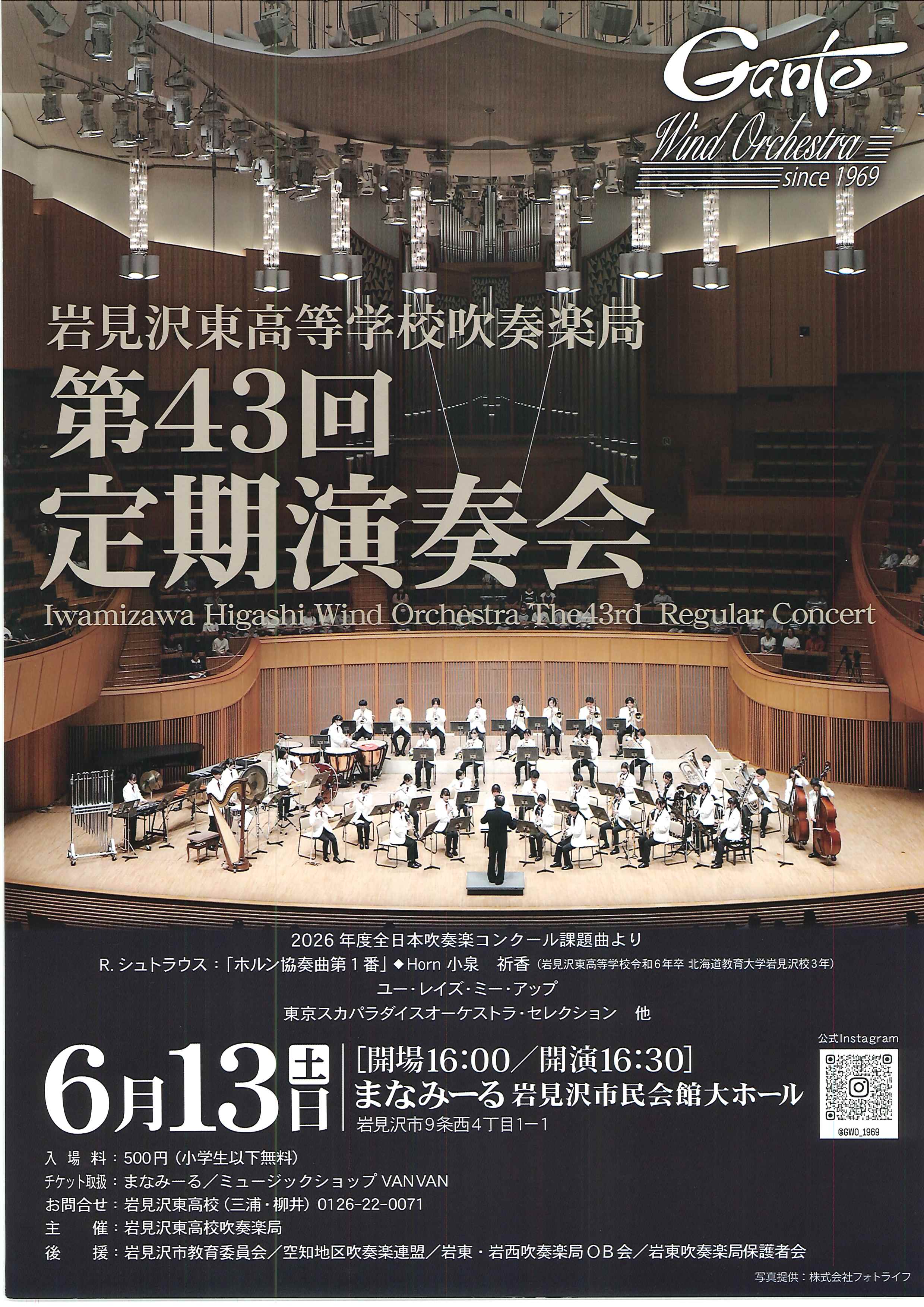 岩見沢東高等学校吹奏楽局 第43回定期演奏会 開催日2026年06月13日(土)開場16:00開演16:30会場まなみーる 岩見沢市民会館大ホール岩見沢市9条西4丁目1-1料金当日:¥500小学生以下無料当店での チケット取扱い無し 出演お問い合わせ岩見沢東高校(三浦・柳井) 0126-22-0071 演奏会情報一覧へ戻る