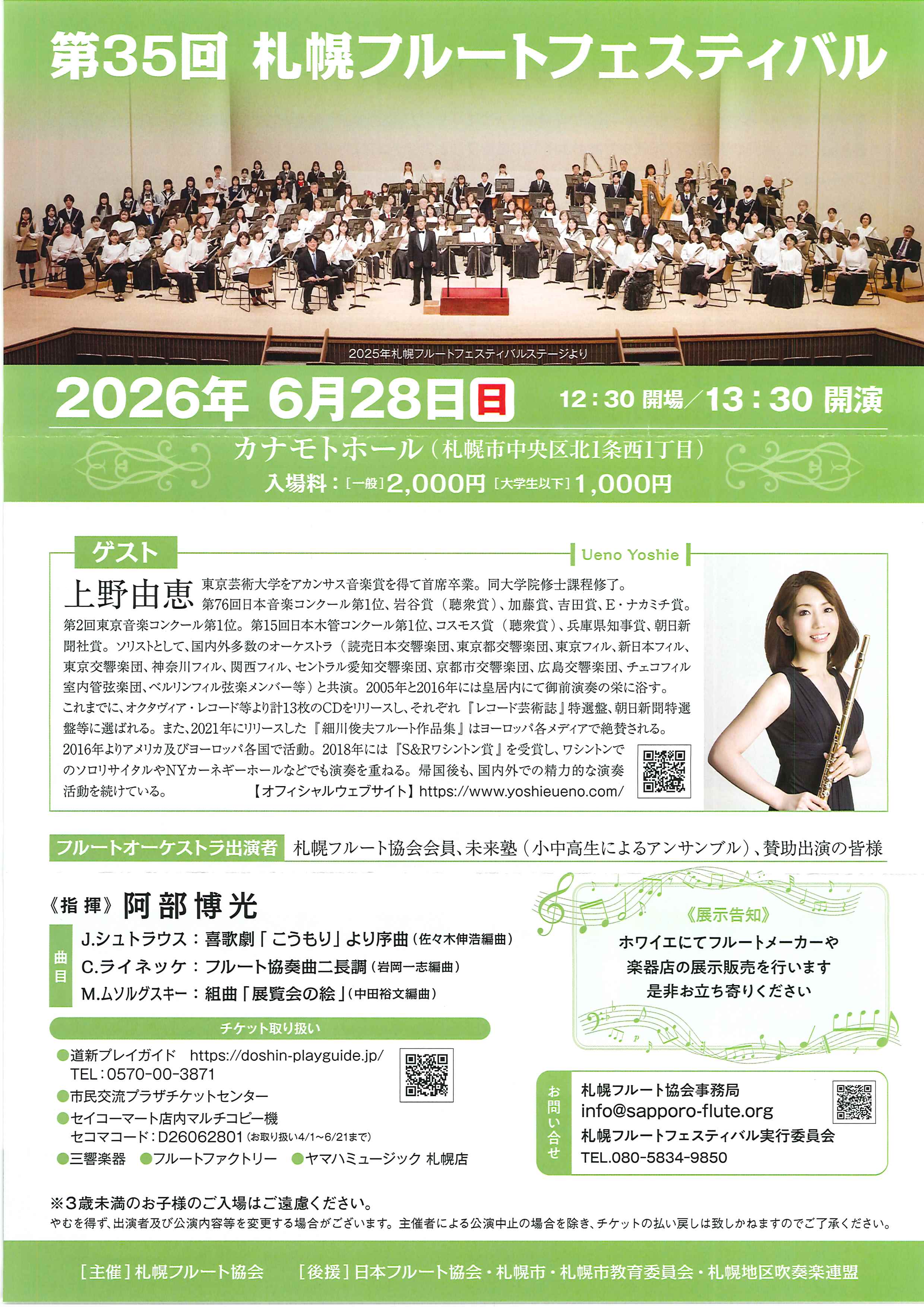 第35回札幌フルートフェスティバル 開催日2026年06月28日(日)開場12:30開演13:30会場カナモトホール(札幌市民ホール)札幌市中央区北1条西1丁目料金当日:¥2,000大学生以下1,000円当店での チケット取扱い有り 出演ゲスト:上野由恵 指揮:阿部博光お問い合わせ札幌フルート協会事務局 011-522-1098 札幌フルートフェスティバル実行委員会 080-5834-9850 演奏会情報一覧へ戻る