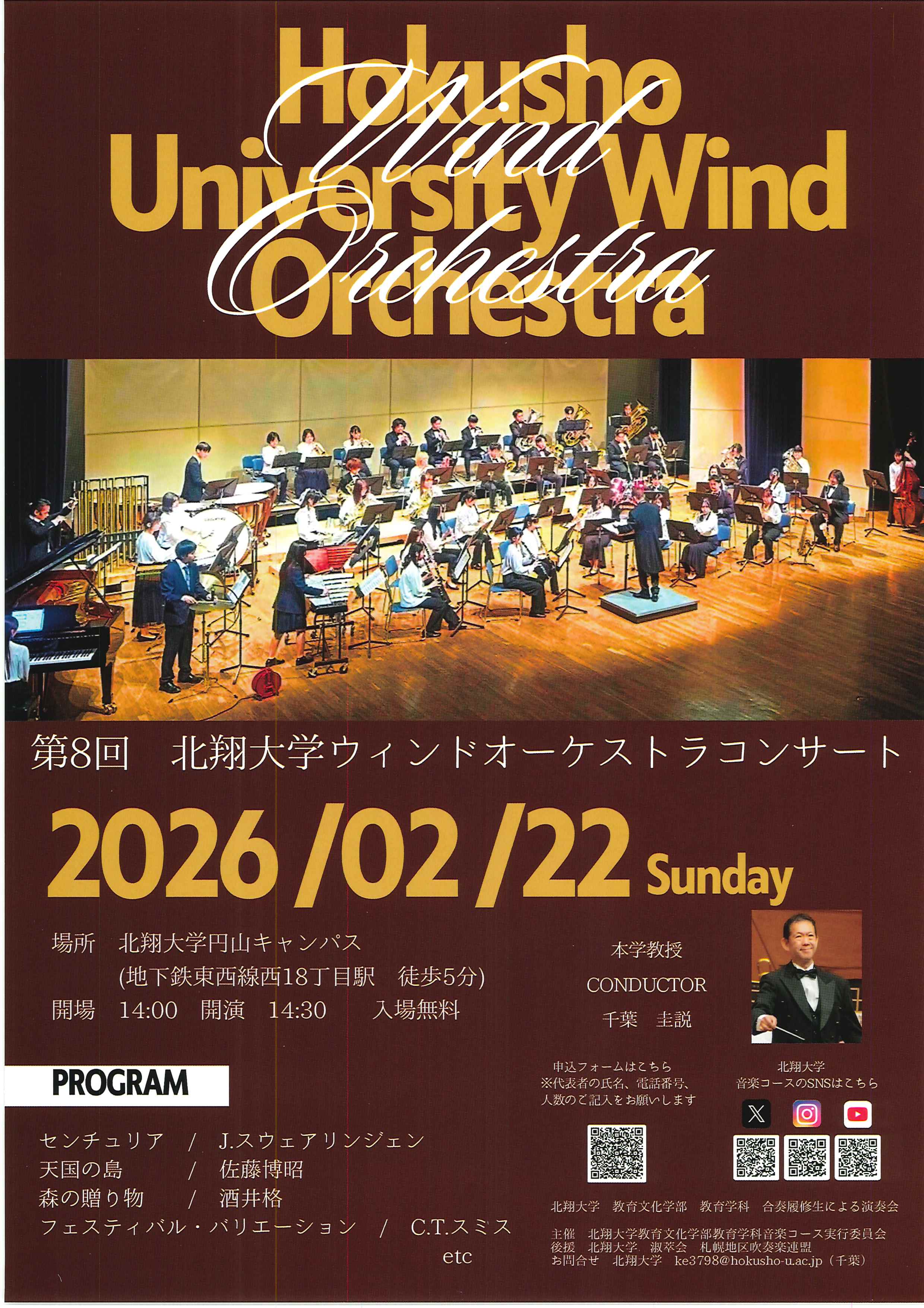 第8回北翔大学ウインドオーケストラコンサート 開催日2026年02月22日(日)開場14:00開演14:30会場北翔大学札幌円山キャンパス地下鉄東西線西18丁目駅 徒歩5分料金入場無料当店での チケット取扱い無し 出演お問い合わせ北翔大学(千葉) ke3798@hokusho-u.ac.jp 演奏会情報一覧へ戻る