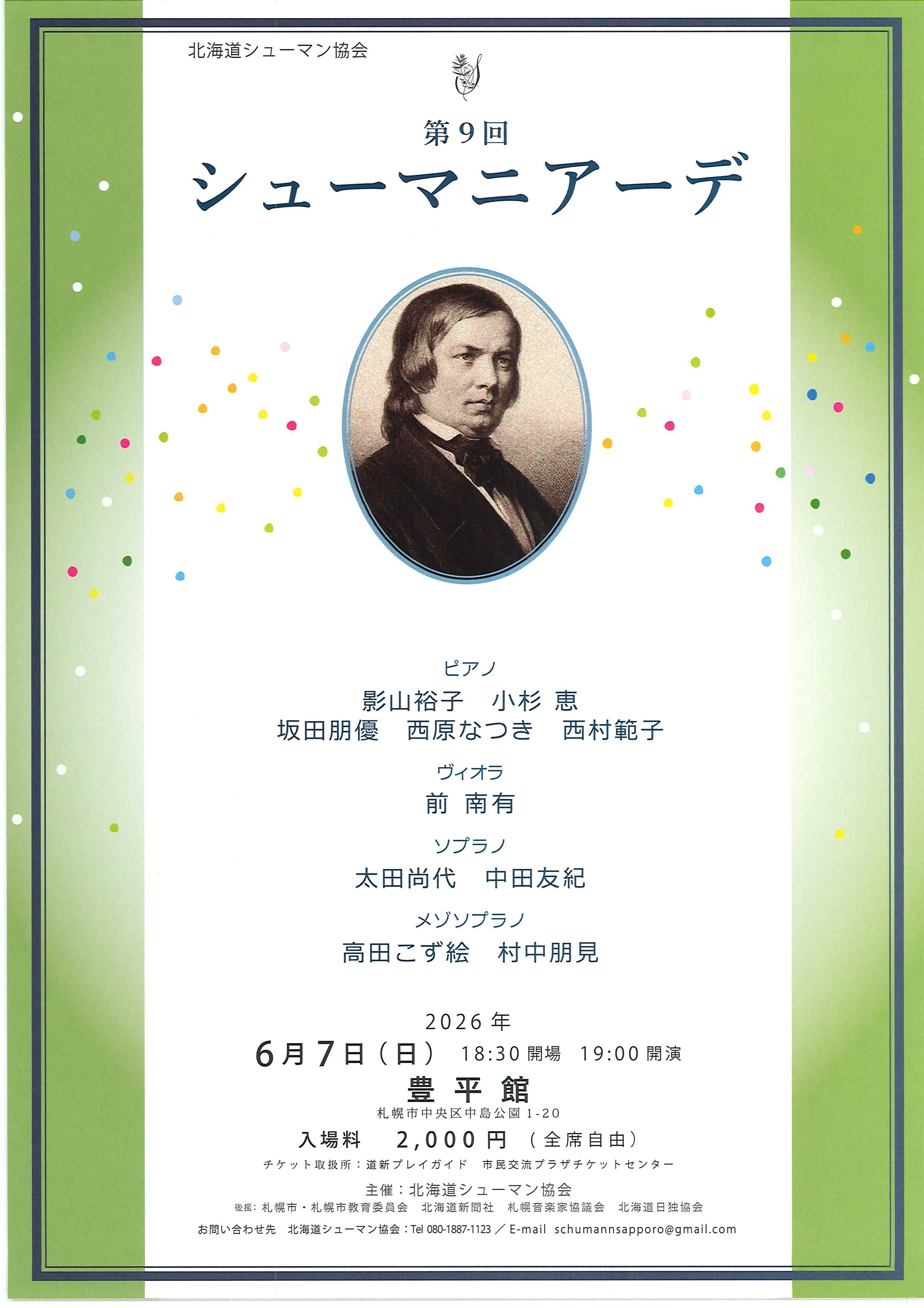 第9回シューマニアーデ 開催日2026年06月07日(日)開場18:30開演19:00会場豊平館札幌市中央区中島公園1番20号料金当日:¥2,000当店での チケット取扱い無し 出演お問い合わせ北海道シューマン協会 ℡ 080-1887-1123 演奏会情報一覧へ戻る