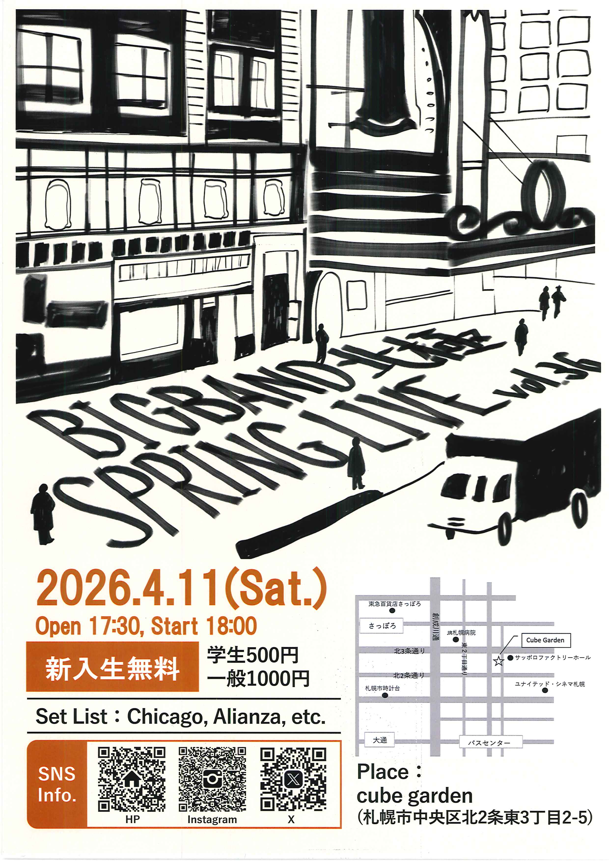 BIGBAND北極 SPRING LIVE vol.36 開催日2026年04月11日(土)開場17:30開演18:00会場cube garden札幌市中央区北2条東3丁目2-5料金当日:¥1,000学生500円当店での チケット取扱い無し 出演備考https://bigbandhokkyoku.wixsite.com/bigbandhokkyokuお問い合わせbigband.hokkyoku@gmail.com 演奏会情報一覧へ戻る