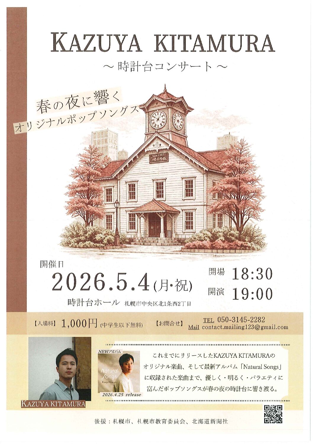 KAZUYA KITAMURA~時計台コンサート~ 開催日2026年05月04日(月・祝)開場18:30開演19:00会場時計台ホール札幌市中央区北1条西2丁目料金当日:¥1,000中学生以下無料当店での チケット取扱い有り 出演KAZUYA KITAMURAお問い合わせTEL:050-3145-2282 MAIL:contact.mailing123@gmail.com 演奏会情報一覧へ戻る