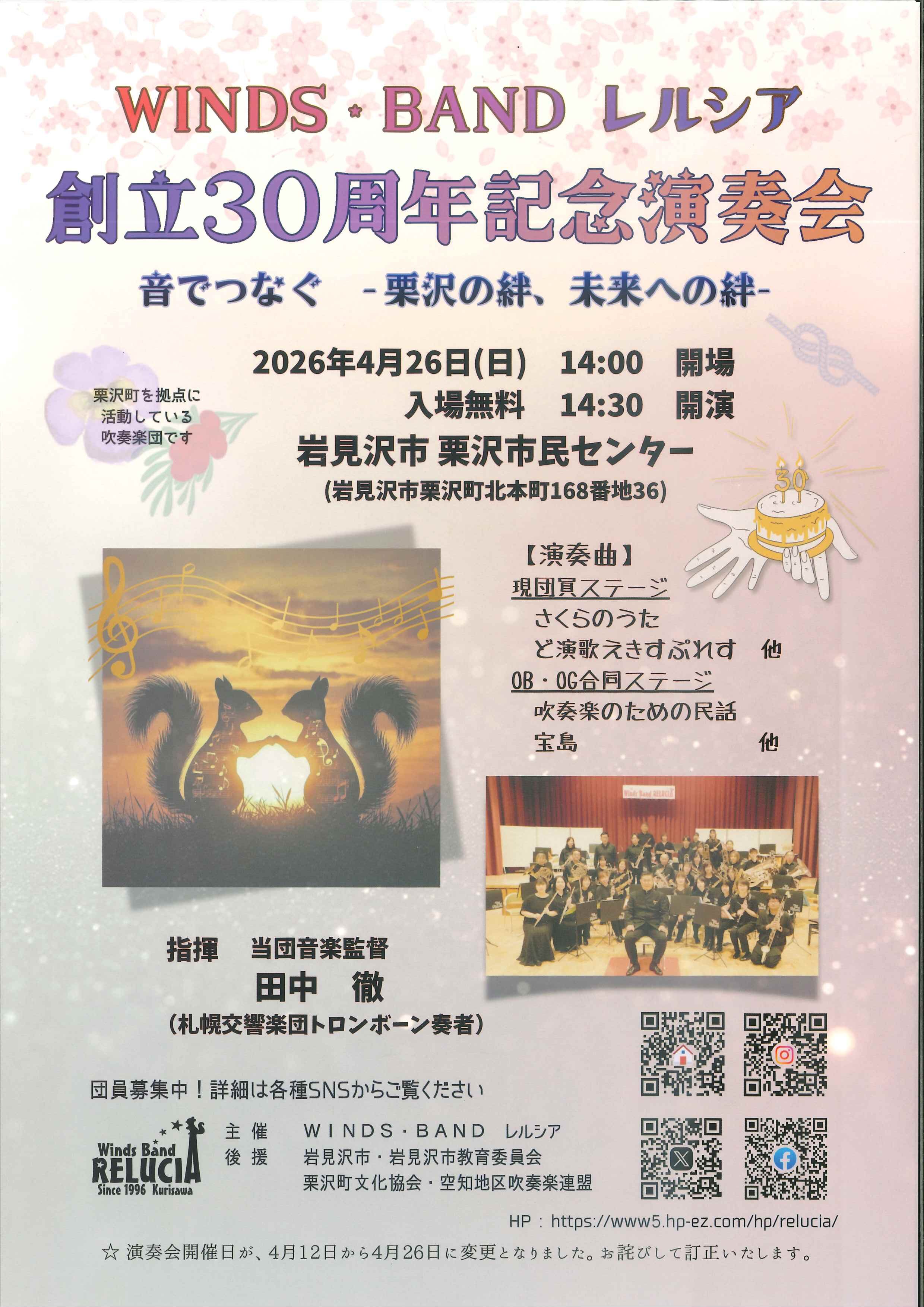 WINDS☆BAND レルシア 創立30周年記念演奏会 開催日2026年04月26日(日)開場14:00開演14:30会場岩見沢市 栗沢市民センター岩見沢市栗沢町北本町168番地36料金当店での チケット取扱い無し 出演 演奏会情報一覧へ戻る